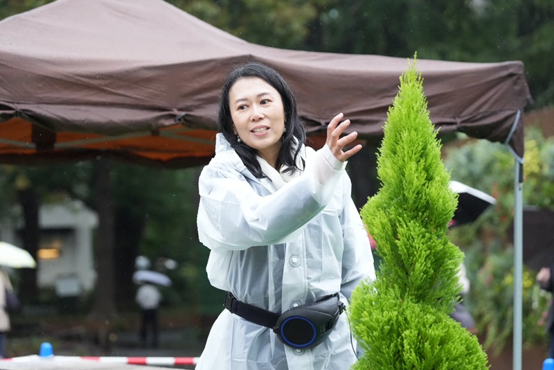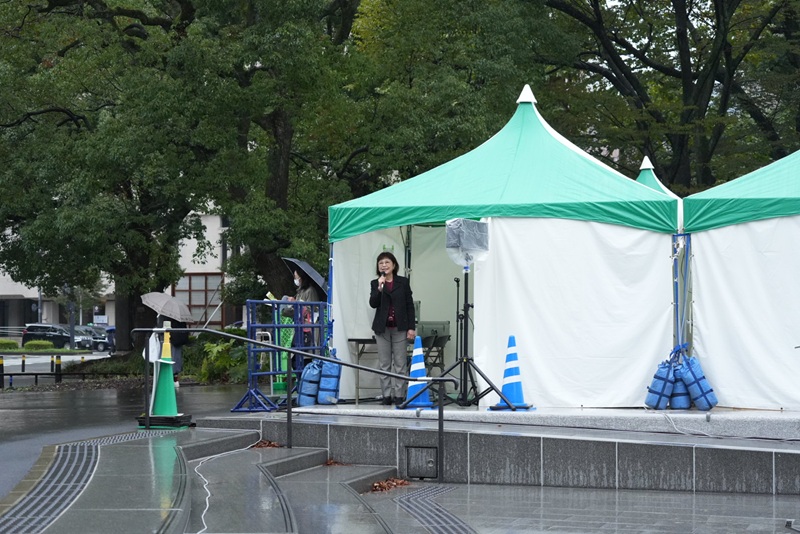 マイク2本で進行する予定が雨でスピーカーもテントに避難し、司会担当の小林さんは拡声器を使うことに。