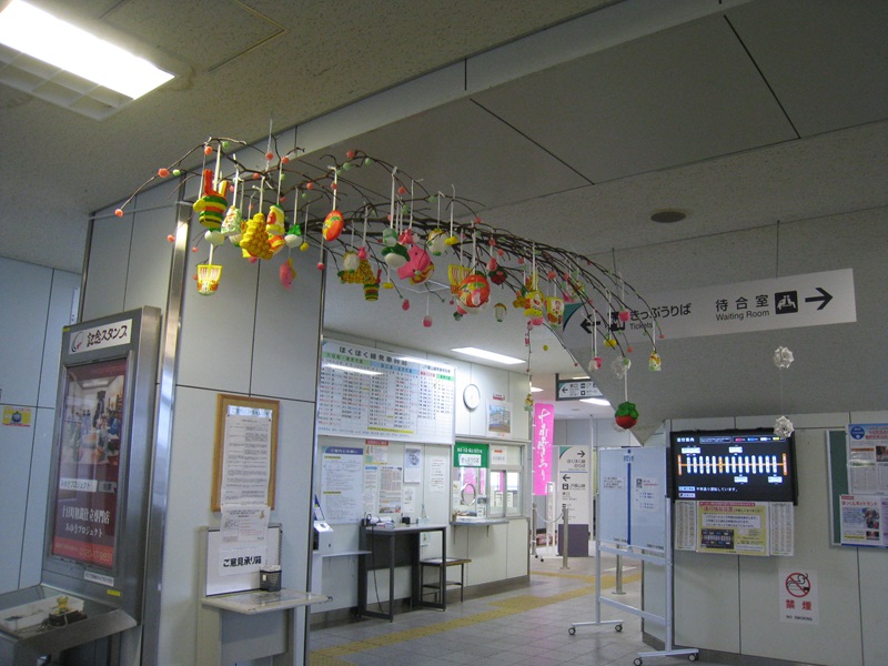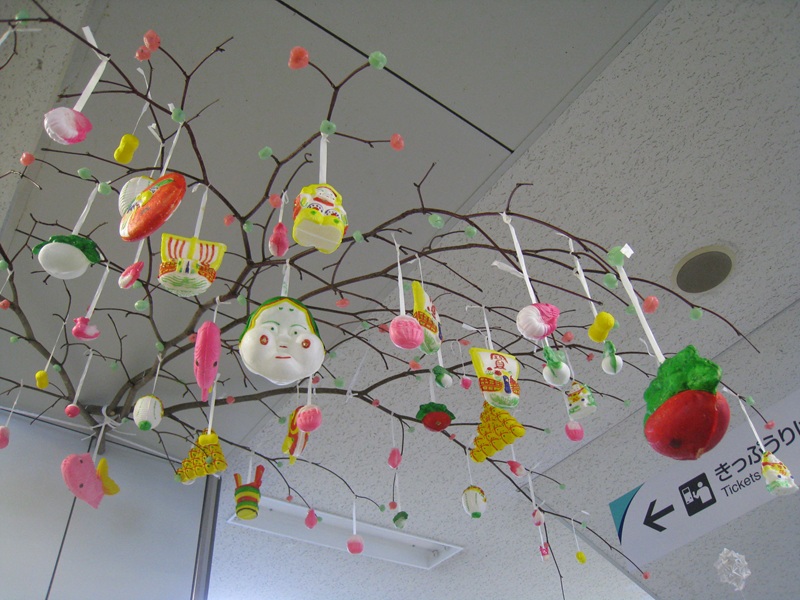 写真は10年ほど前に撮った北越急行ほくほく線の駅構内に飾っていた「まゆだま飾り」。