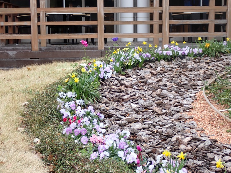 トピアリーの周辺に植えた花々の隙間からスイセンが頭をもたげています。