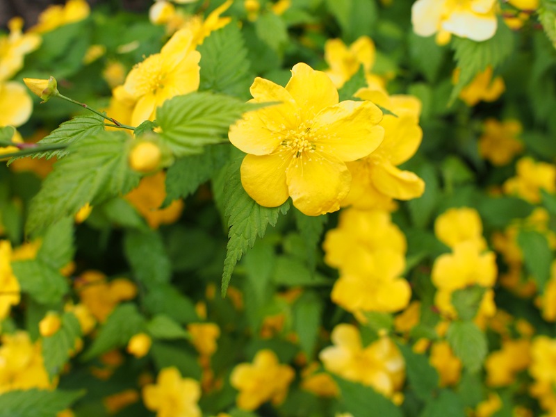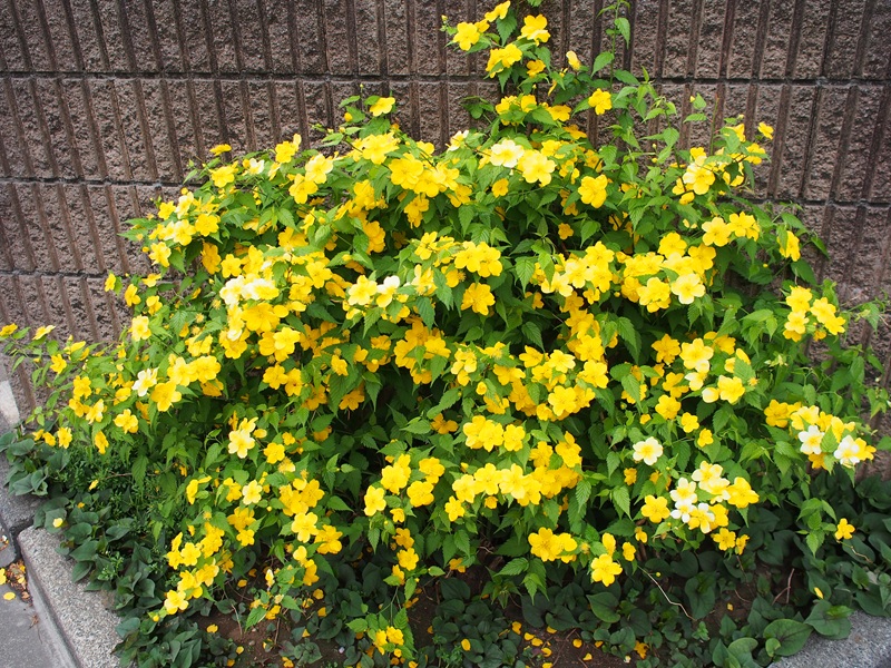 写真は隅切り(道路の角に面した土地で、車の通行の妨げにならないよう角を斜めに切り落とした)部分)したわずかな土面に植えたヤマブキ。