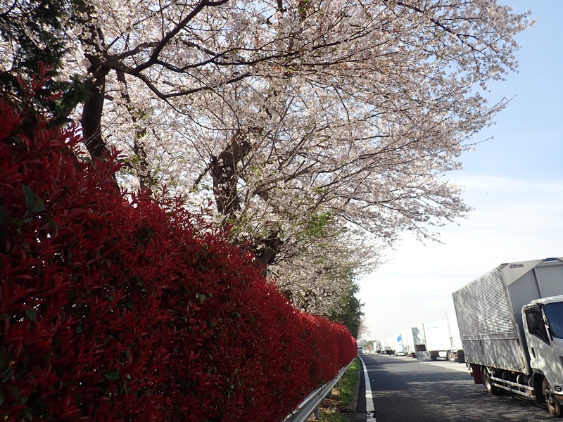 満開の桜とレッド・ロビン(ベニカナメモチ)