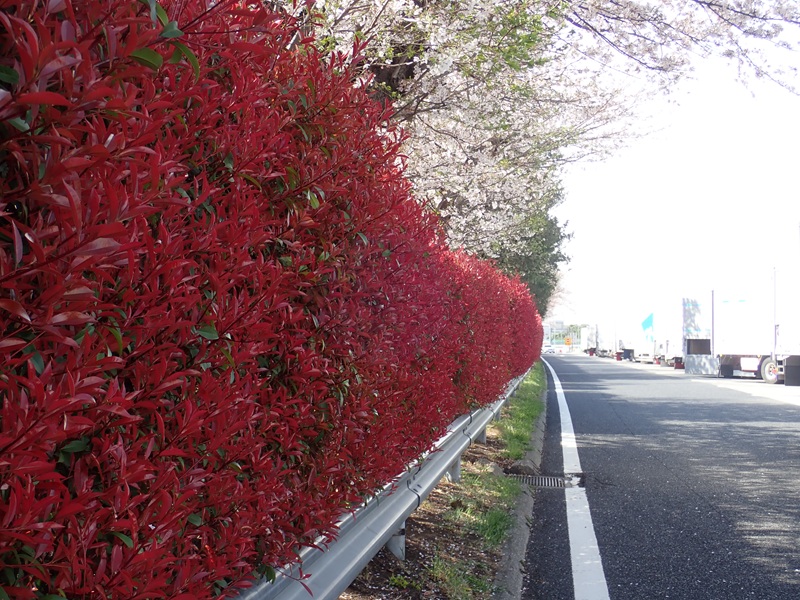 熱帯アジア産のオオカナメモチとの交配によってつくられた「レッド・ロビン」は1980年代以降、住宅の生垣や、道路の緑化(路側帯)として広く植栽されるようになり、現在もその人気は続いています。